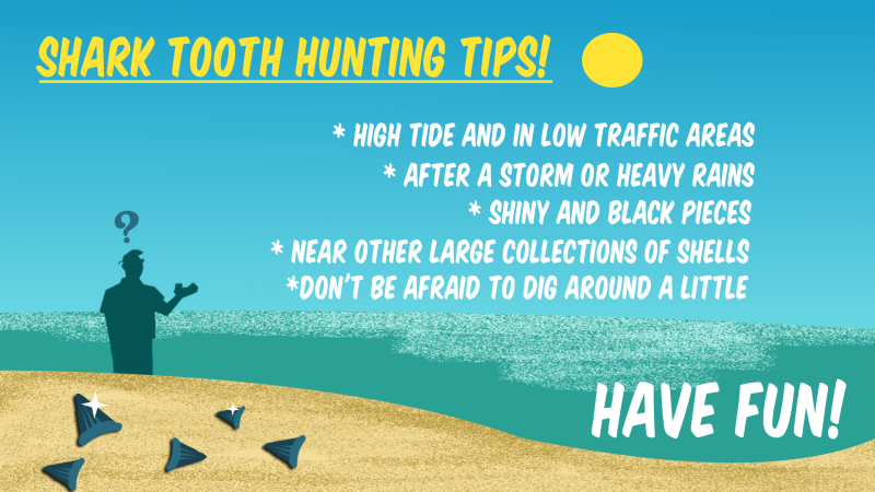 When the seas are churning or strong rains inland occur, the fossils and teeth that are nestled in sediment are tussled free and will wash down to our beaches!